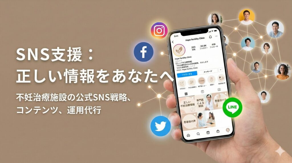 玉石混交の情報があふれるSNS。不妊治療施設が発信する正しい不妊治療情報をユーザーの皆様に正しく届けるため、不妊治療施設のInstagramをはじめとした、各種公式SNSの戦略・コンセプト設計、コンテンツ制作、投稿・運用代行等各種支援を続けています。
